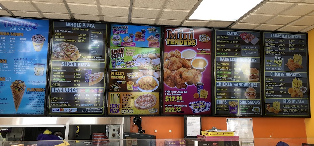 The menu features a variety of hearty options, with highlights such as crispy chicken and chips, flavorful rotis filled with chicken, beef, or lentils, and classic fast food staples like burgers and pepperoni pizza. For a lighter refreshment or a sweet finish, choices like vanilla cherry ice cream and refreshing bottled drinks complement the savory dishes well.